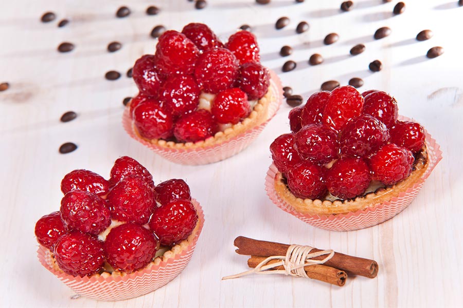 Delikatny kruchy korpus wypełniony kremem budyniowo – śmietanowym, obłożony sezonowymi owocami bądź mandarynką z syropu, spryskane słodką żelką.