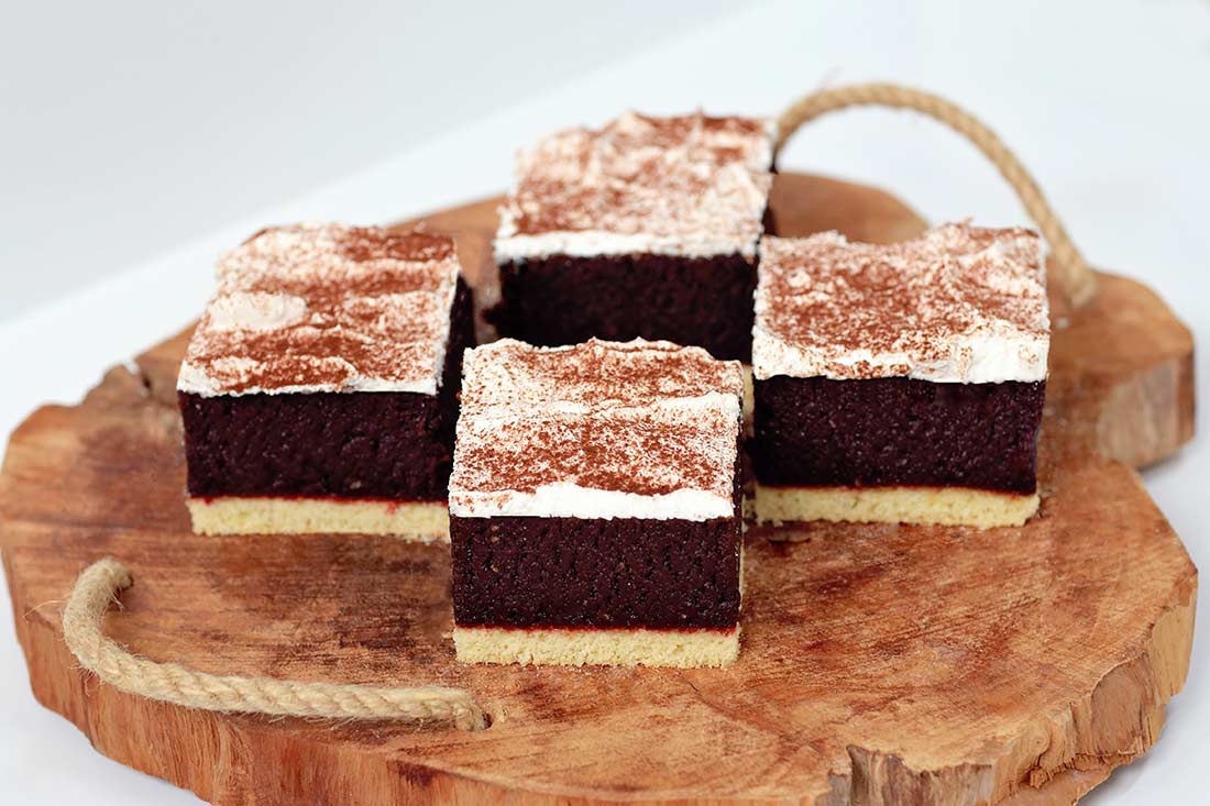 Spód biszkoptowo-tłuszczowy przesmarowany marmoladą wieloowocową i ciastem czekoladowym połączonym kremem z dodatkiem rumu, wykończone śmietanką, przyprószone kakao.