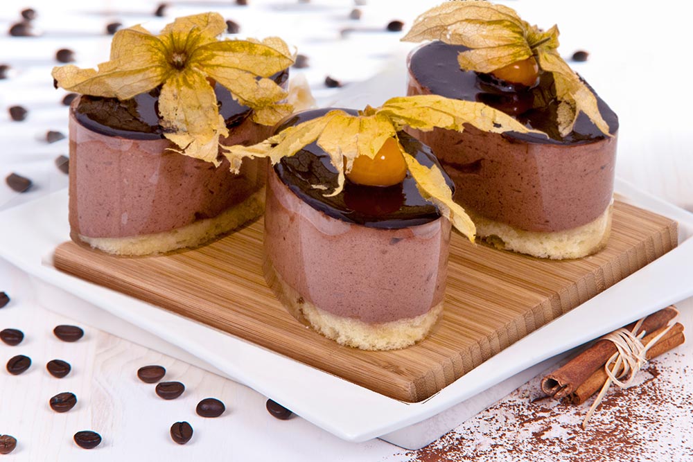 delikatny biszkopt przykryty masą na bazie bitej śmietanki o smaku czekoladowym. Całość wykończona polewą czekoladową z owocem.