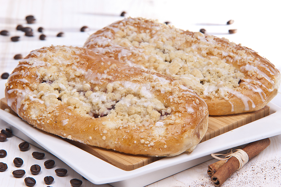 Ciasto drożdżowe z całymi połówkami śliwki, obsypane kruszonką z dodatkiem prawdziwego masła, przesmarowane delikatnie pomadą.