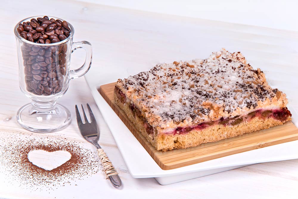 Ciasto biszkoptowo tłuszczowe z rabarbarem, truskawką i czerwoną porzeczką z warstwą bezy przyprószoną ciemną i jasną kruszonką.