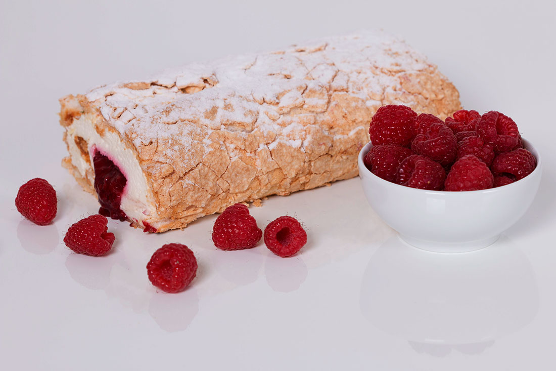 Delikatna śmietanowa masa z dodatkiem wyśmienitych malin, otulona płaszczykiem biszkoptu bezowego i przyprószona cukrem pudrem. Daje to niebiańskie połączenie, rozpływające się w ustach.