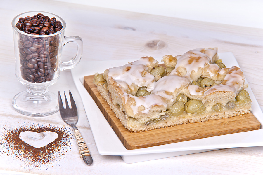 Korzenne ciasto biszkoptowo-tłuszczowe, zwinięte z solidną warstwą intensywnie doprawionych powideł śliwkowych w roladę polaną w całości czekoladą deserową.