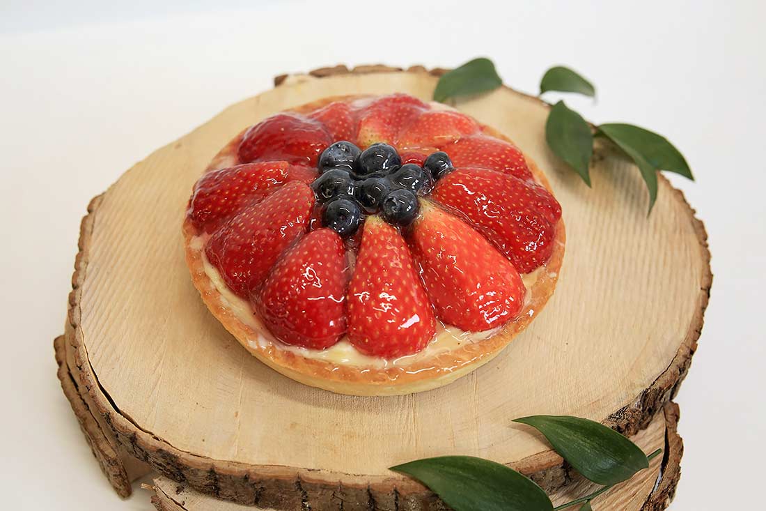 Tartaletka z ciasta kruchego wypełniona kremem budyniowym ze śmietanką, przykryta dostępnymi świeżymi owocami i słodką żelką.