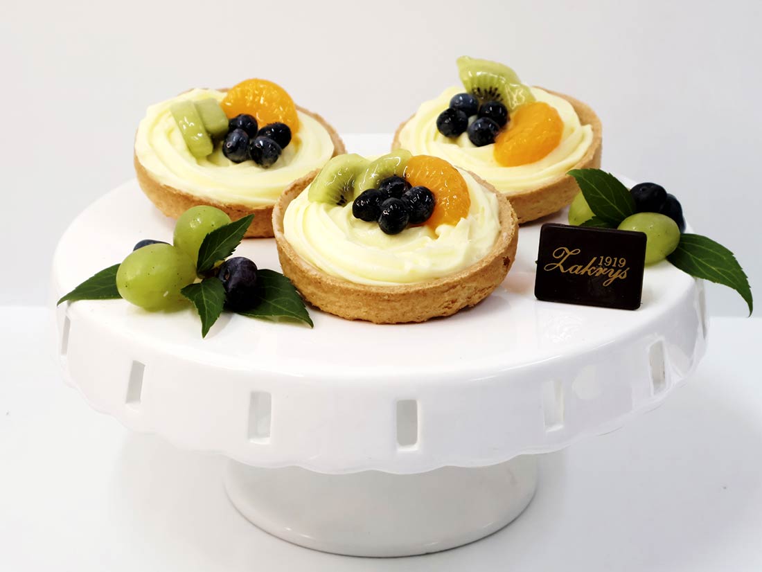 kruchy korpus migdałowy wypełniony kremem budyniowo-śmietankowym z dodatkiem owoców – mix.