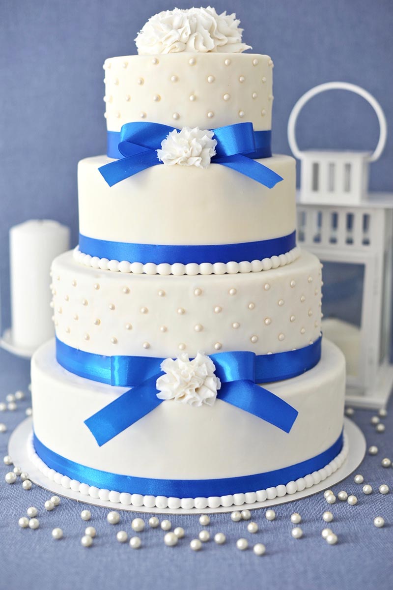 Tort weselny w masie cukrowej, kształt okrągły, stelaż ukryty wewnątrz tortu. Piętra nakładane jedno na drugie, wysokość jednego piętra około 9 cm.