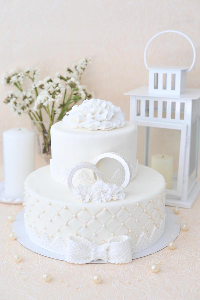 Tort weselny w masie cukrowej, kształt okrągły, stelaż ukryty wewnątrz tortu. Piętra nakładane jedno na drugie, wysokość jednego piętra około 9 cm.