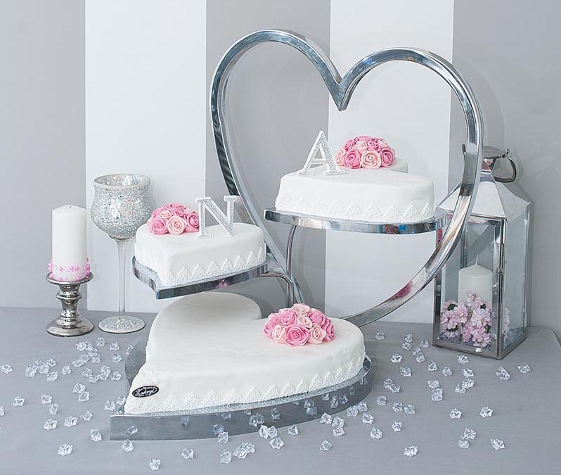 Tort weselny w masie cukrowej, piętra tortu rozłożone, kształt serce, wysokość jednego piętra około 7 cm.