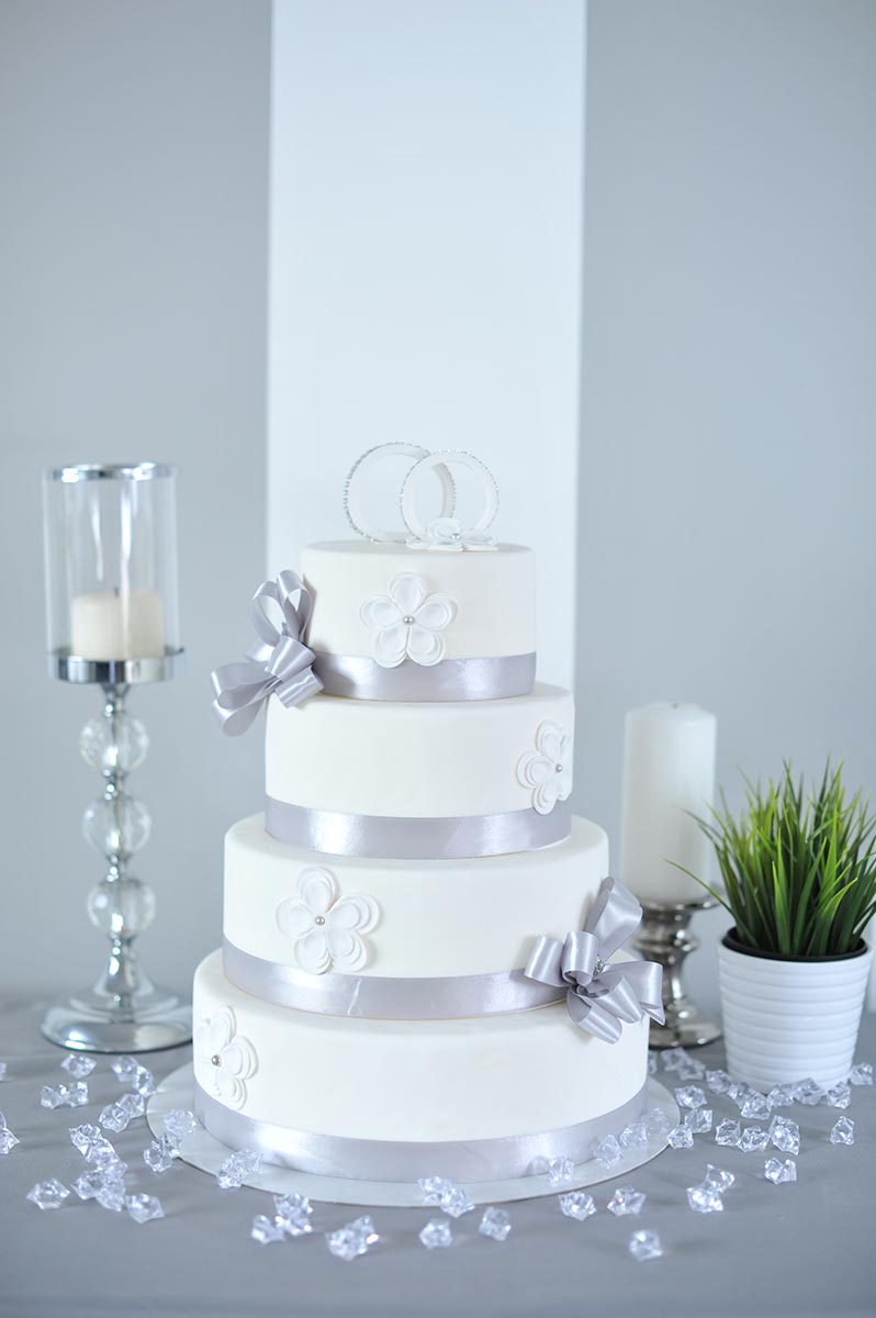 Tort weselny w masie cukrowej, kształt okrągły, stelaż ukryty wewnątrz tortu. Piętra nakładane jedno na drugie, wysokość jednego piętra około 9 cm.