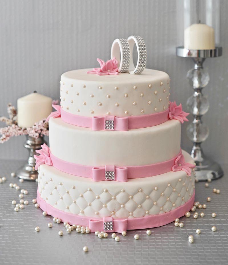 Tort weselny w masie cukrowej, kształt okrągły, stelaż ukryty wewnątrz tortu. Piętra nakładane jedno na drugie, wysokość jednego piętra około 9 cm.
