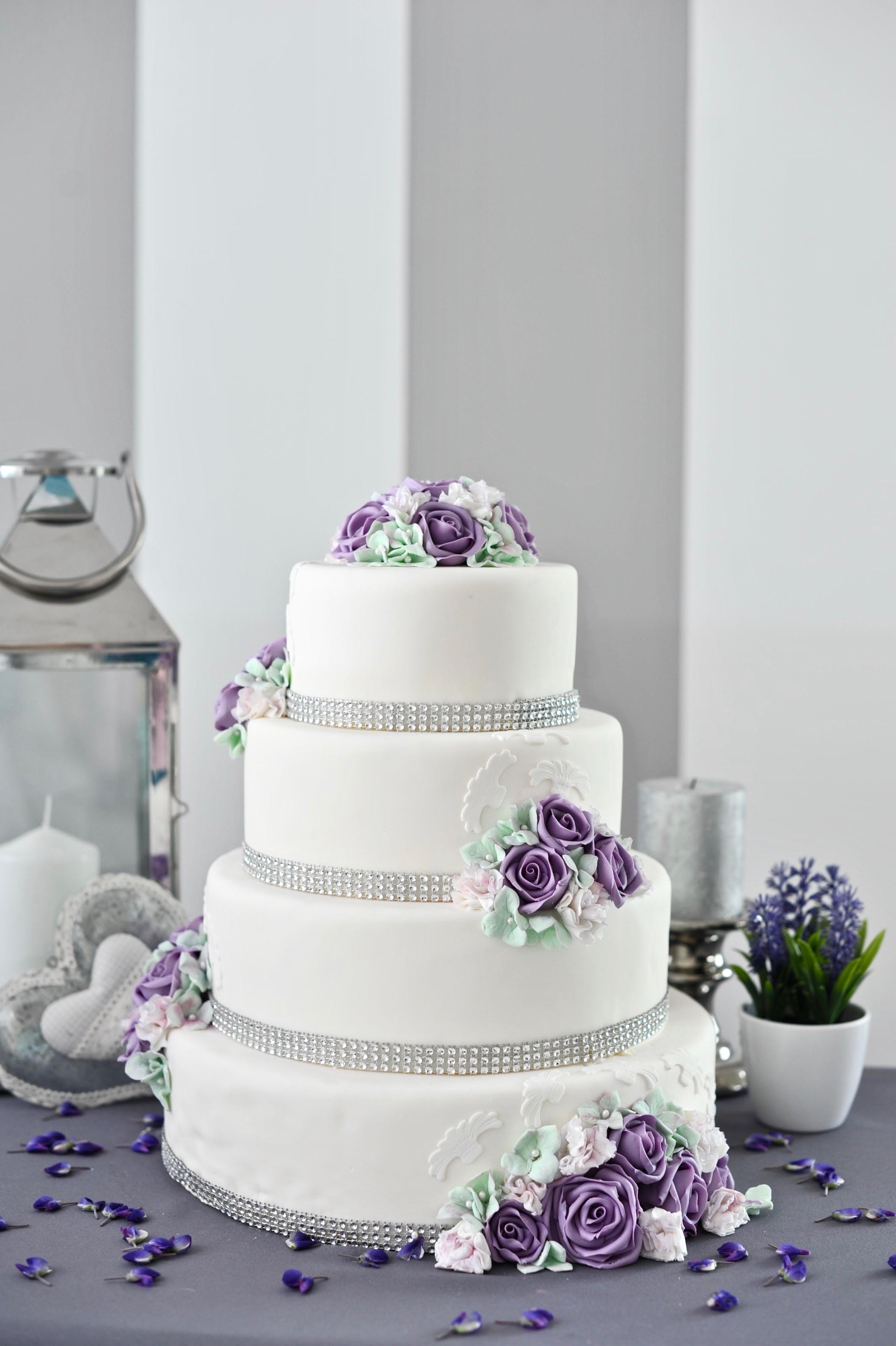 Tort weselny w masie cukrowej, kształt okrągły, stelaż ukryty wewnątrz tortu. Piętra nakładane jedno na drugie, wysokość jednego piętra około 9 cm.