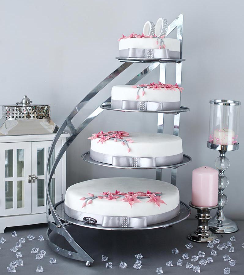 Tort weselny w masie cukrowej w kształcie żagla, wysokość jednego piętra około 7 cm.