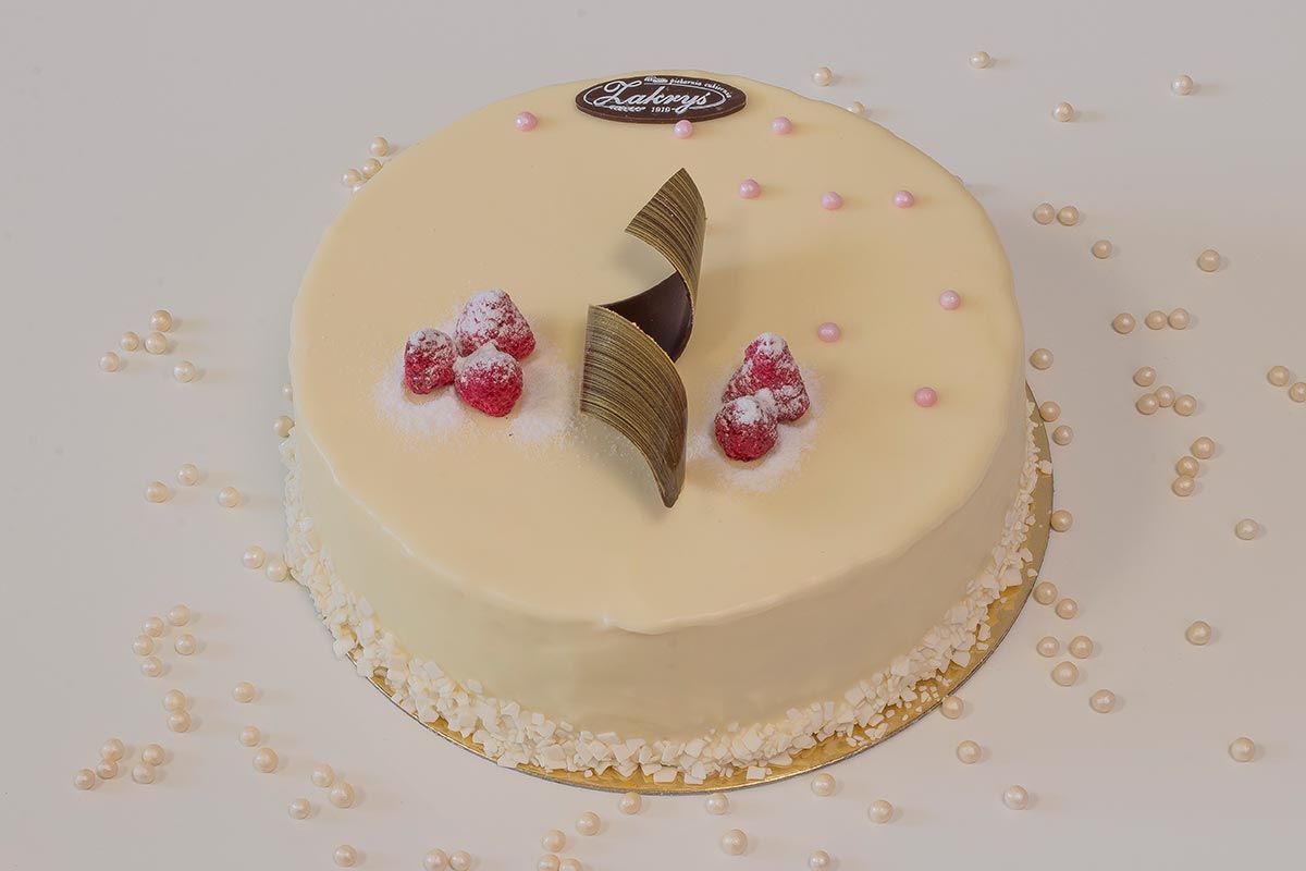 Na bazie śmietanki i czekolady deserowej, przełożony prażoną maliną na krążku biszkoptu czekoladowego.