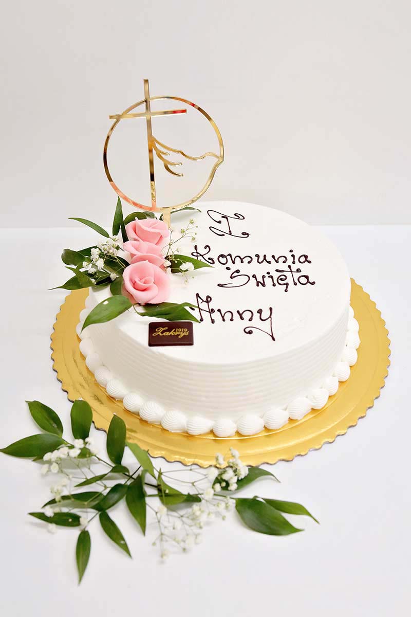 - Napis na torcie : Pierwsza Komunia Święta + imię dziecka o ile zmieści się na zamówionym torcie wedle wielkości tortu