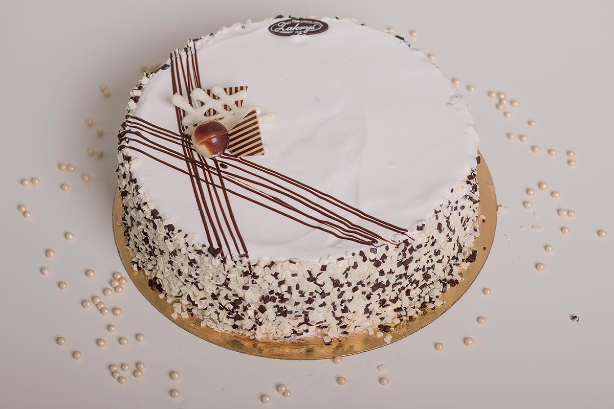Krążek czekoladowy oraz rolady biszkoptowe nasączone ponczem waniliowym, przełożone pyszną masą na bazie ubitej naturalnej śmietanki i białej czekolady.
