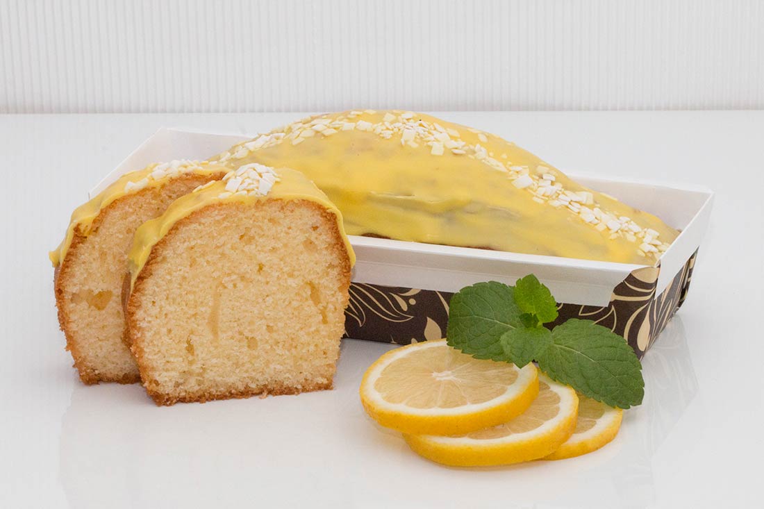 Klasyczna babka piaskowa biszkoptowo tłuszczowa o smaku cytryny w polewie cytrynowej udekorowana posypką z białej czekolady.