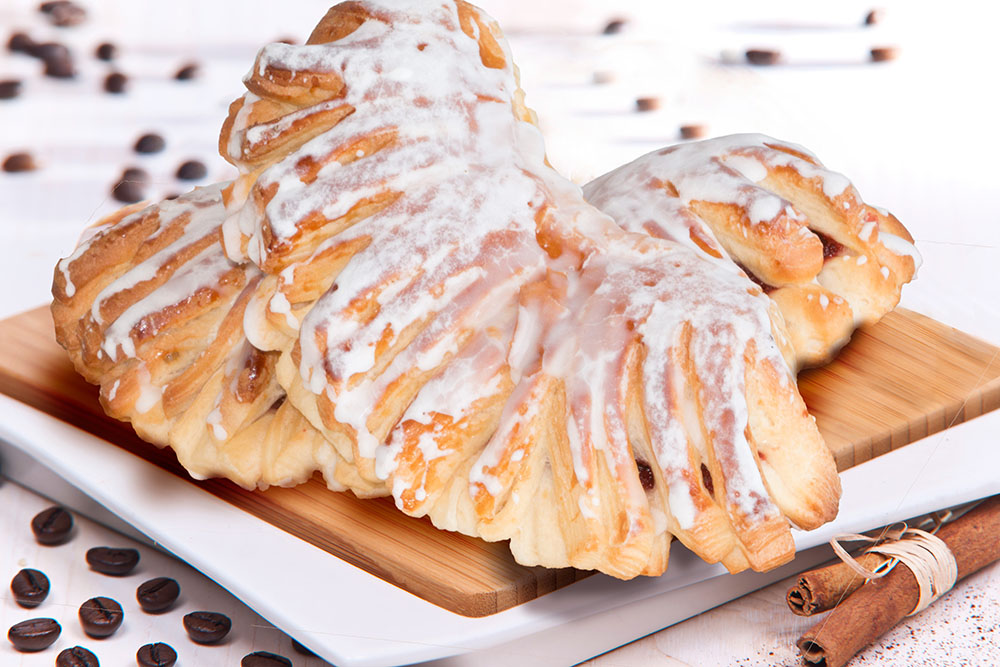 Ciasto półfrancuskie wypełnione nadzieniem z marmolady wieloowocowej wykończone pomadą wodną.