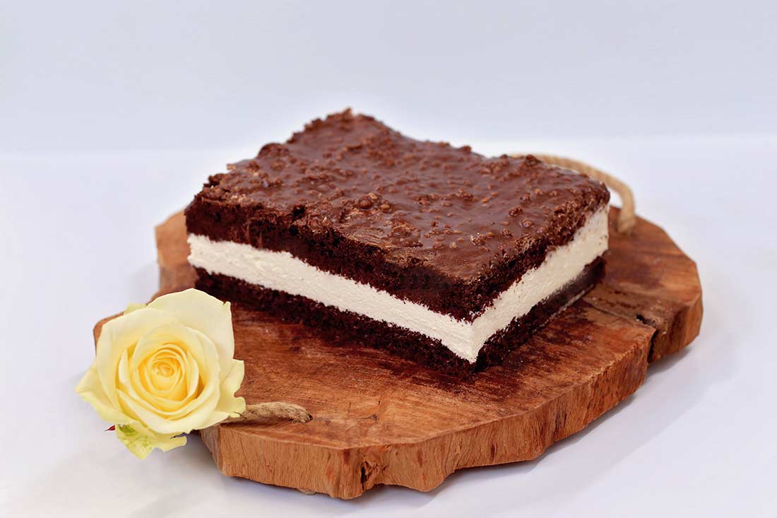 Ciasto czekoladowe z bezą, okryte delikatną śmietanką z mascarpone. Całość wykończona pyszną czekoladą z chrupiącą prażynką.