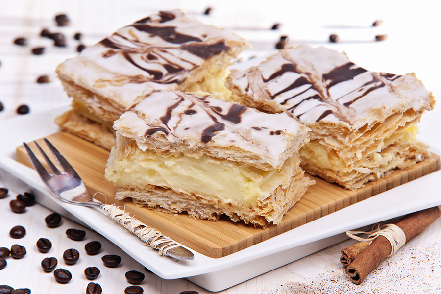 Ciasto francuskie przełożone kremem budyniowym połączonym ze śmietaną, wykończone dużą ilością pomady, delikatnie polane czekoladą.