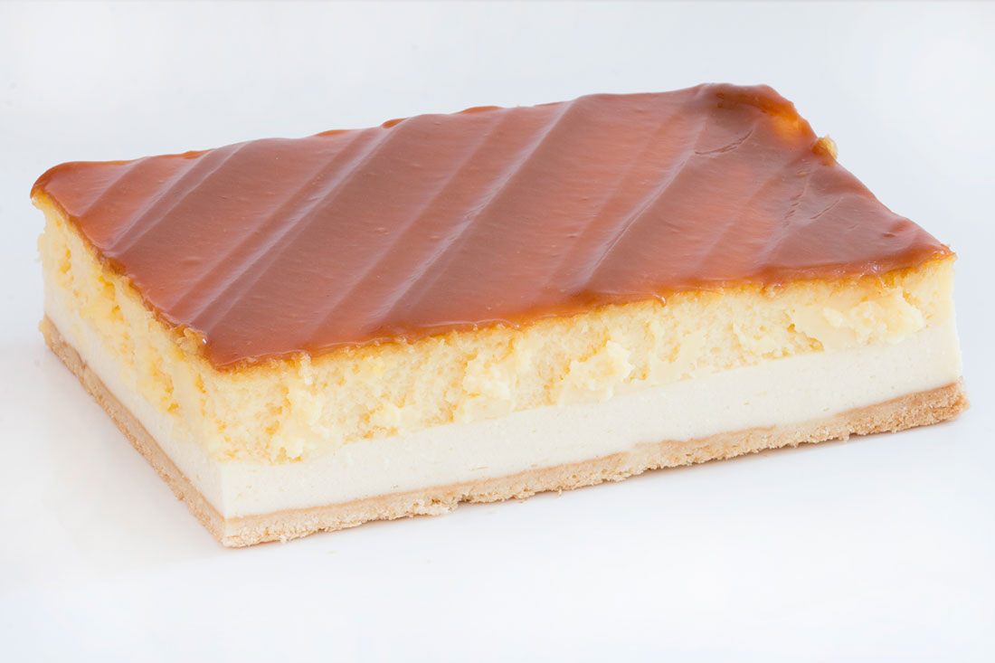 biszkoptowo-tłuszczowy spód, nakryty puszystą masą serową oraz kremem brulee, wykończony pysznym kajmakiem.