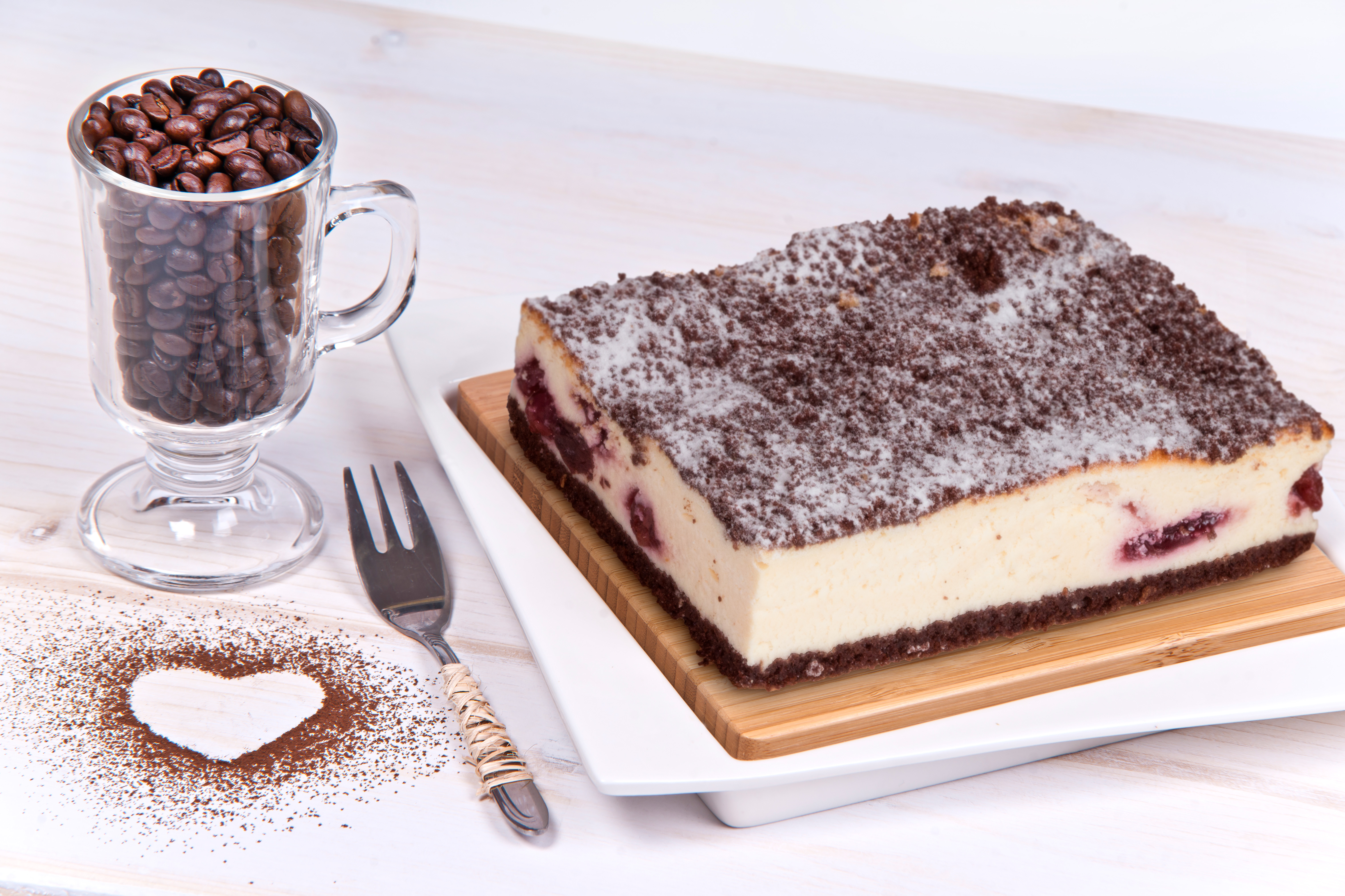 Ciemny spód przełożony wiśnią, zalany masą serową, wykończony kruszonką czekoladową i posypany cukrem pudrem.