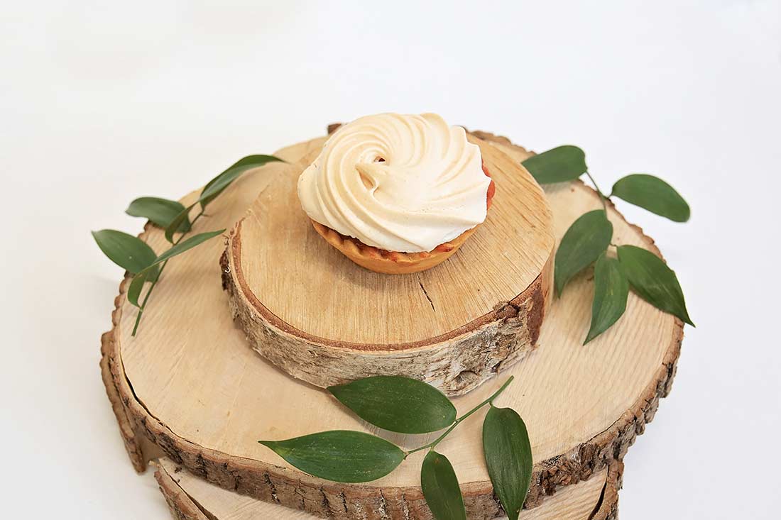 Krucha tartaletka wypełniona nadzieniem rabarbarowym, przykryta pyszną bezą.