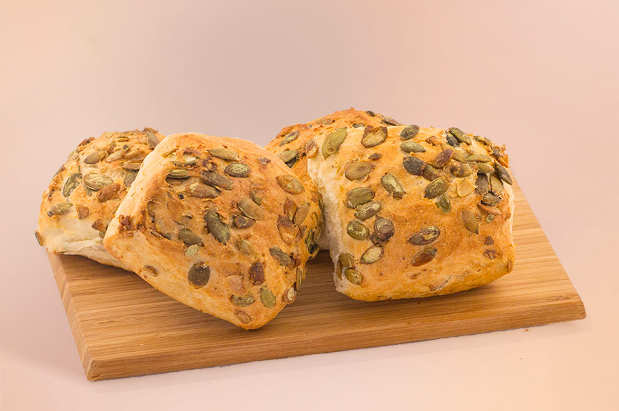 Bułka pszenna z dodatkiem pestek dyni. Dynia posiada dużo właściwości zdrowotnych a przy tym jest bardzo smaczna. Nie zawiera dużo kalorii z czego możemy się dodatkowo cieszyć kosztując ten produkt.