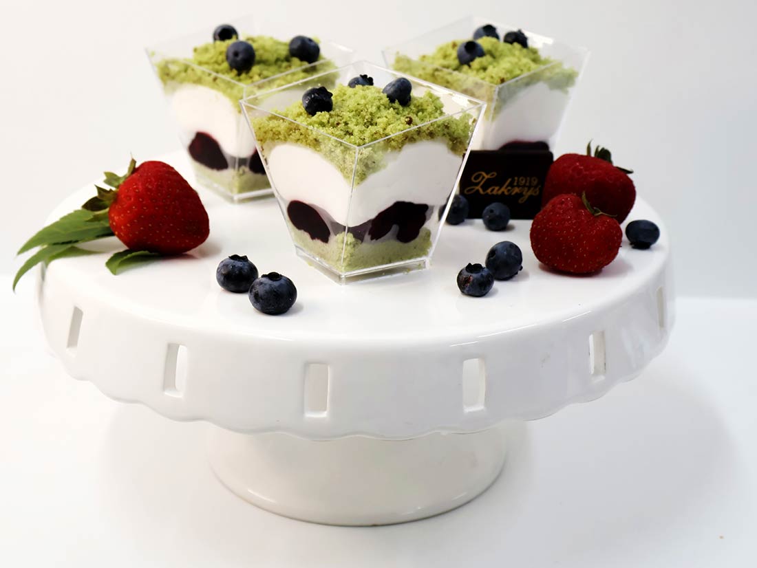 spód biszkoptowy o smaku zielonej herbaty, przełożony wiśnią w żelu oraz delikatną bitą śmietanką o smaku waniliowym, całość wykończona pokruszonym biszkoptem w towarzystwie owocu (sezonowego)