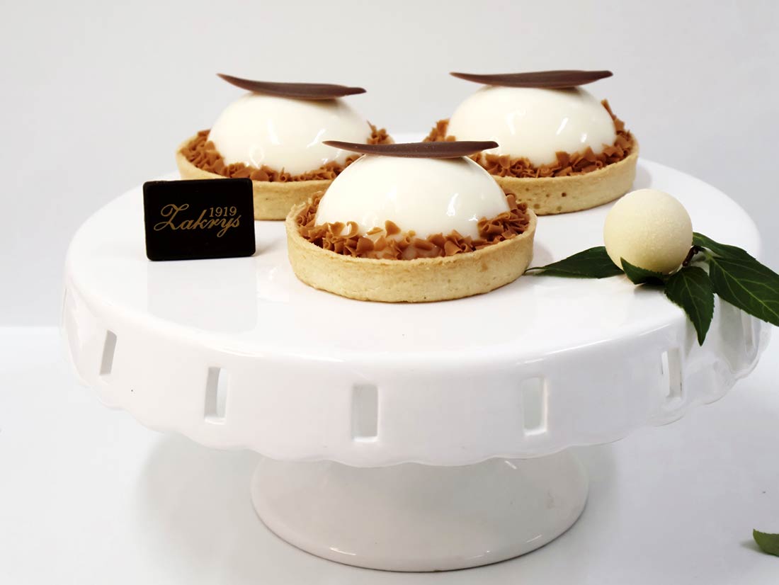 spód krucha francuska tartoletka przesmarowana toffi, przykryta masą na bazie bitej śmietanki o smaku waniliowym w kształcie półkuli, z nadzieniem z owocu maliny, dookoła wykończona posypką karmelową.