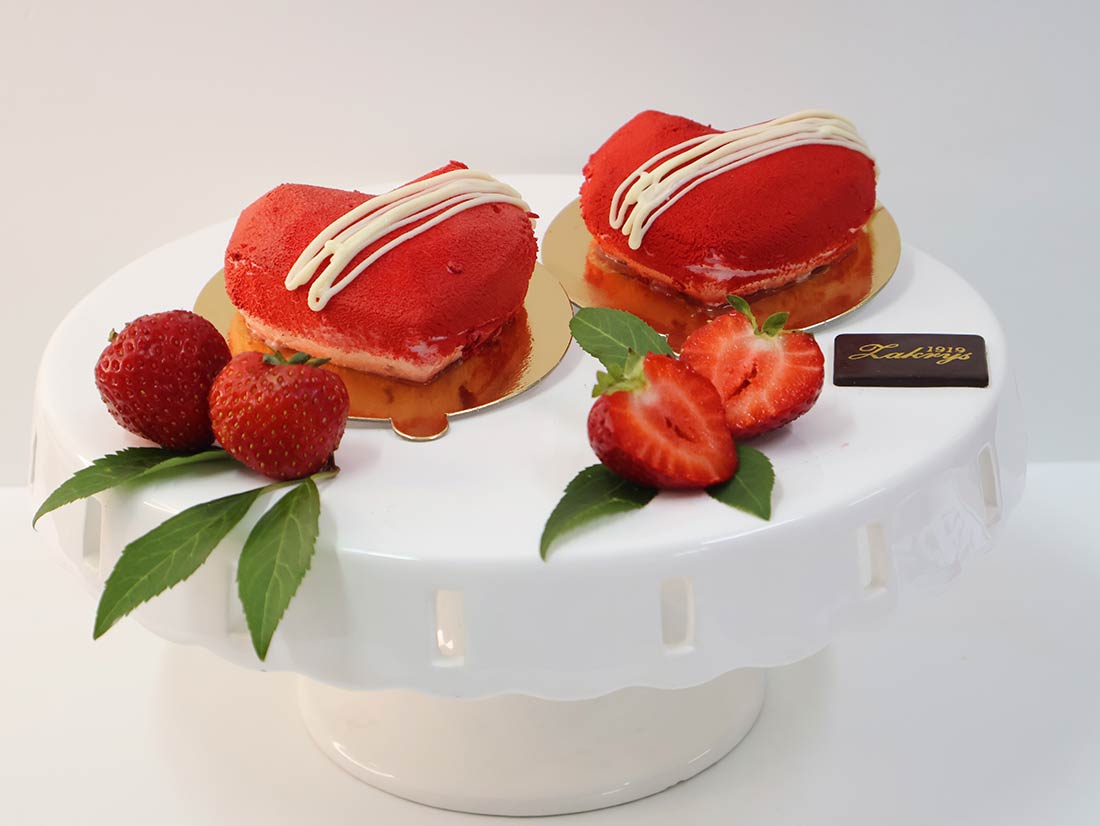 masa na bazie naturalnej bitej śmietanki o smaku truskawkowym, z nadzieniem owocu truskawki w żelu. Całość wykończona czerwonym zamszem z delikatną dekoracją cukrową.