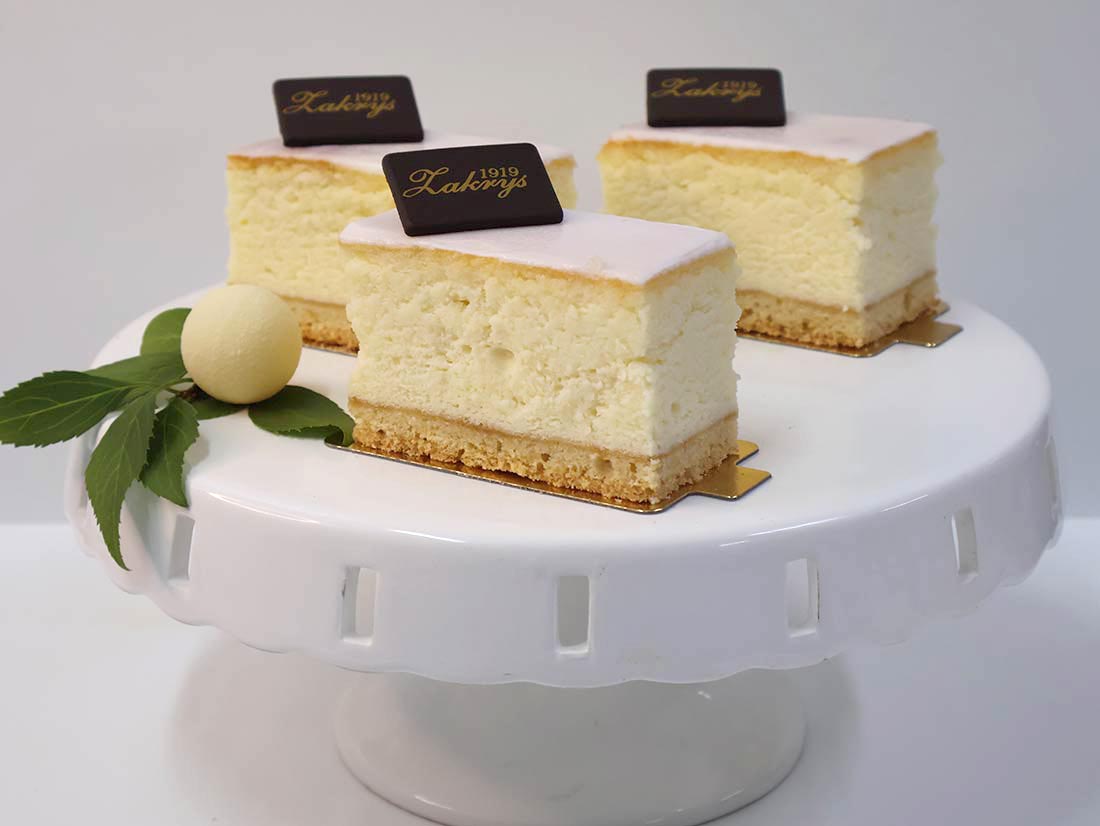 spód z ciasta biszkoptowo tłuszczowego, masa serowa na bazie masła i chudego wiejskiego twarogu oraz aromatu waniliowego. Całość wykończona pomadą oraz firmową czekoladką.