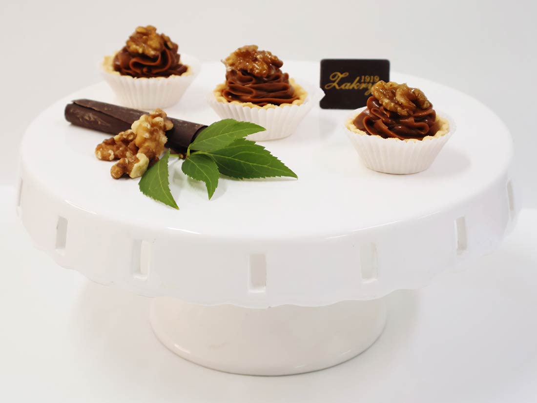 kruchy korpus wypełniony masą kajmakową udekorowany orzechem włoskim.
