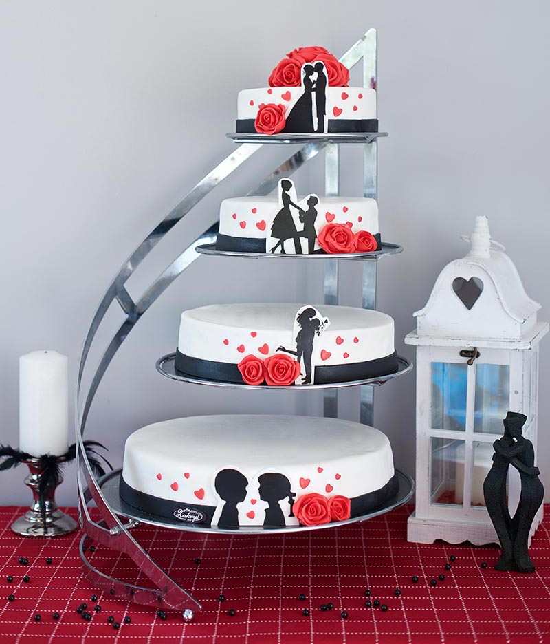 Tort weselny w masie cukrowej w kształcie żagla, wysokość jednego piętra około 7 cm.