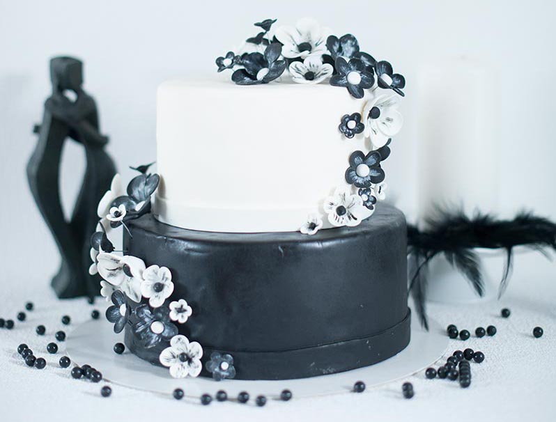 Tort weselny w masie cukrowej, kształt okrągły, stelaż ukryty wewnątrz tortu. Piętra nakładane jedno na drugie, wysokość jednego piętra około 9 cm.