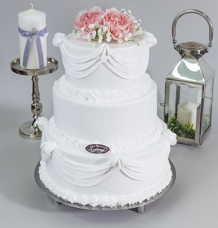Torty weselne obrabiane śmietaną wysokość piętra 9 cm (stelaż ukryty wewnątrz tortu), każde piętro może mieć inny smak.