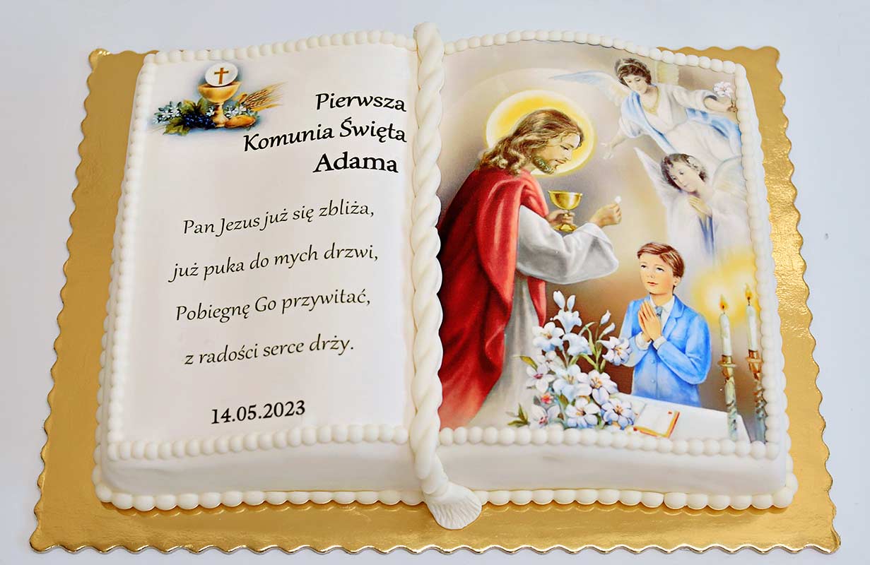 - - nadruk na opłatku „Pierwsza Komunia Święta + imię dziecka”, wierszyk, data uroczystości Obrazek Jezus z chłopcem